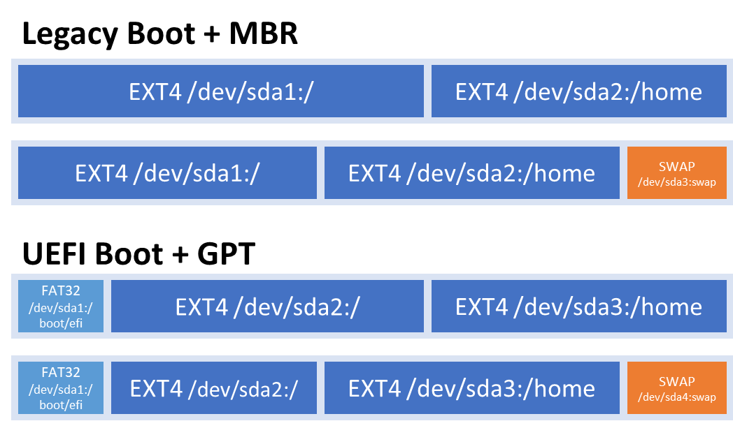 另可添加 home 分区,挂载到“/home”,存放个人文件,系统滚挂后个人文件不会丢