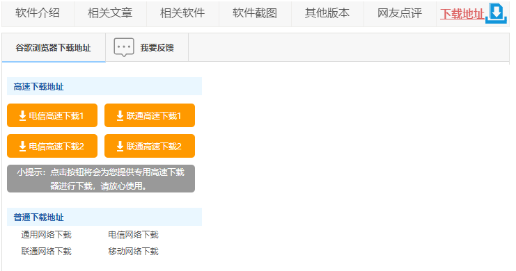 这里我们可见,“高速下载器通道”千万不能点,而应该点“其他下载地址”,一般下载站真正的下载按钮会是“XX铁通下载”或“XX电信下载”,点击即可下载。