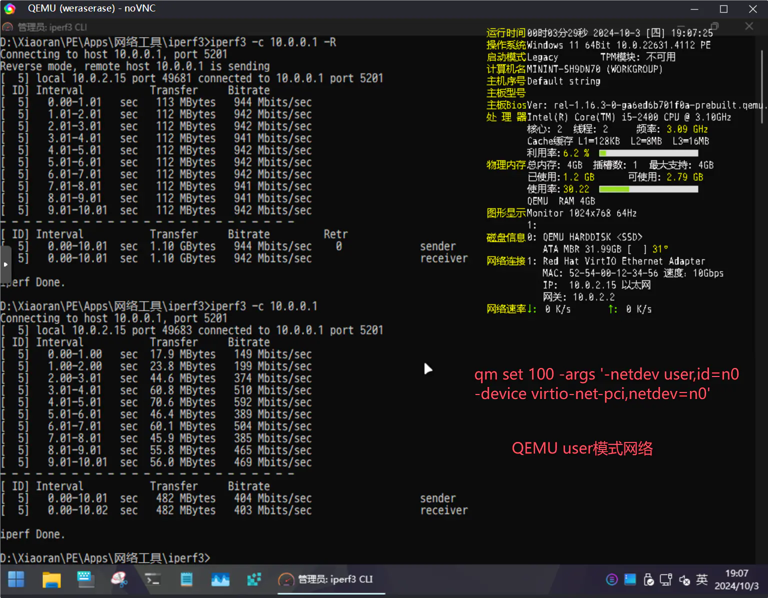 如果您不方便给 Proxmox VE 的 Docker 容器使用 host 网络类型,您也可以使用 QEMU 的 User 模式进行上网。相当于 QEMU 自动完成了 NAT 操作,只要容器能上网虚拟机就能上网。由于不是专业的转发软件,性能比较一般。属于是有不起 OpenWRT 又配置不起 NAT 才用的方案。而且这种情况下基本不用想着搭建服务了,怎么从外部访问还要再打一个问号。