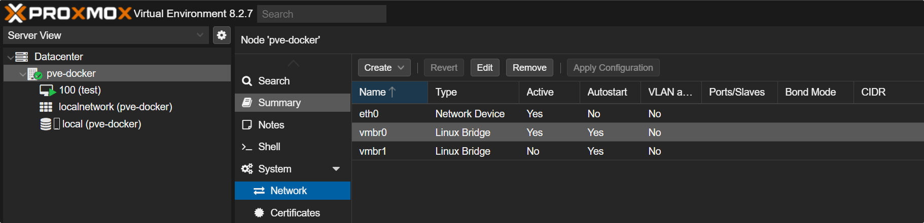 建议配置好后重启一下 Proxmox VE 的容器,刷新一下使 vmbr0 被识别为 Active 状态。