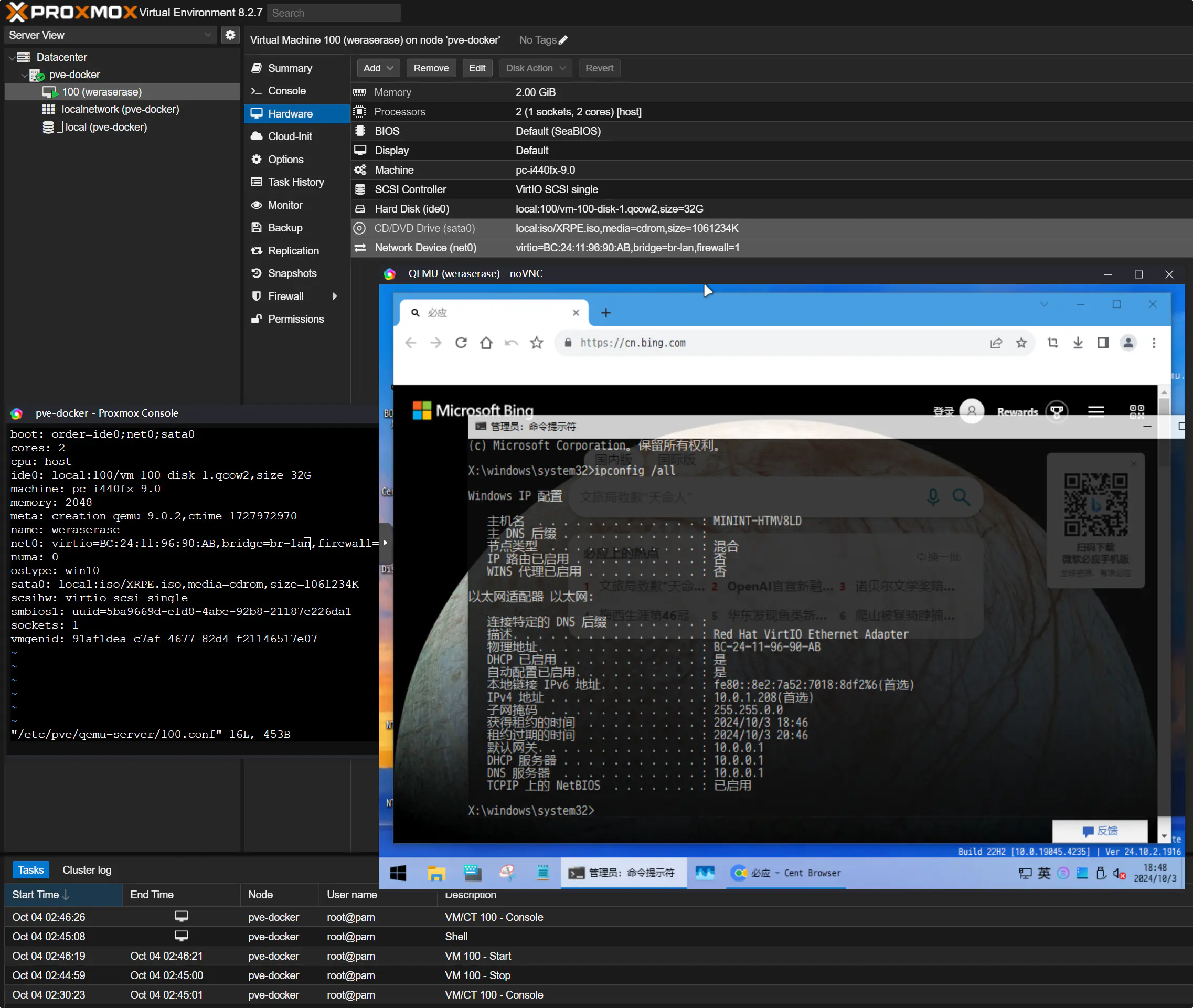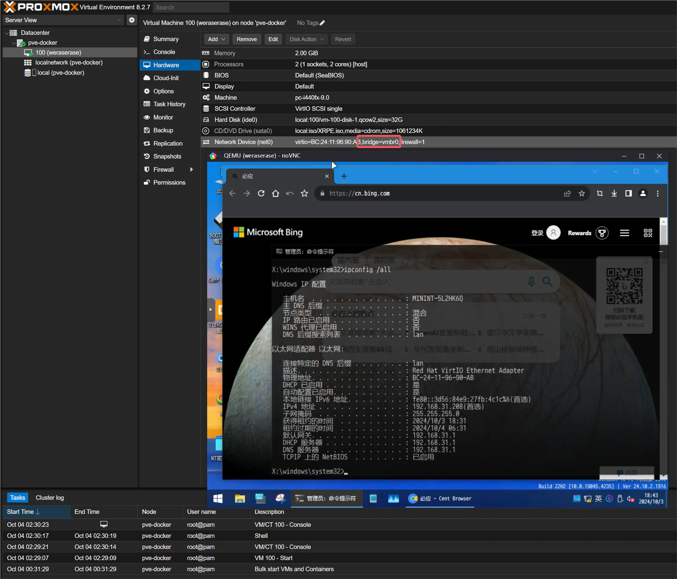 虚拟机开机后会通过 perl 脚本自动创建 TAP 设备加入到这个 vmbr0(正常操作),即可通过 NAT 上网,PVE 里面啥也不用设置。