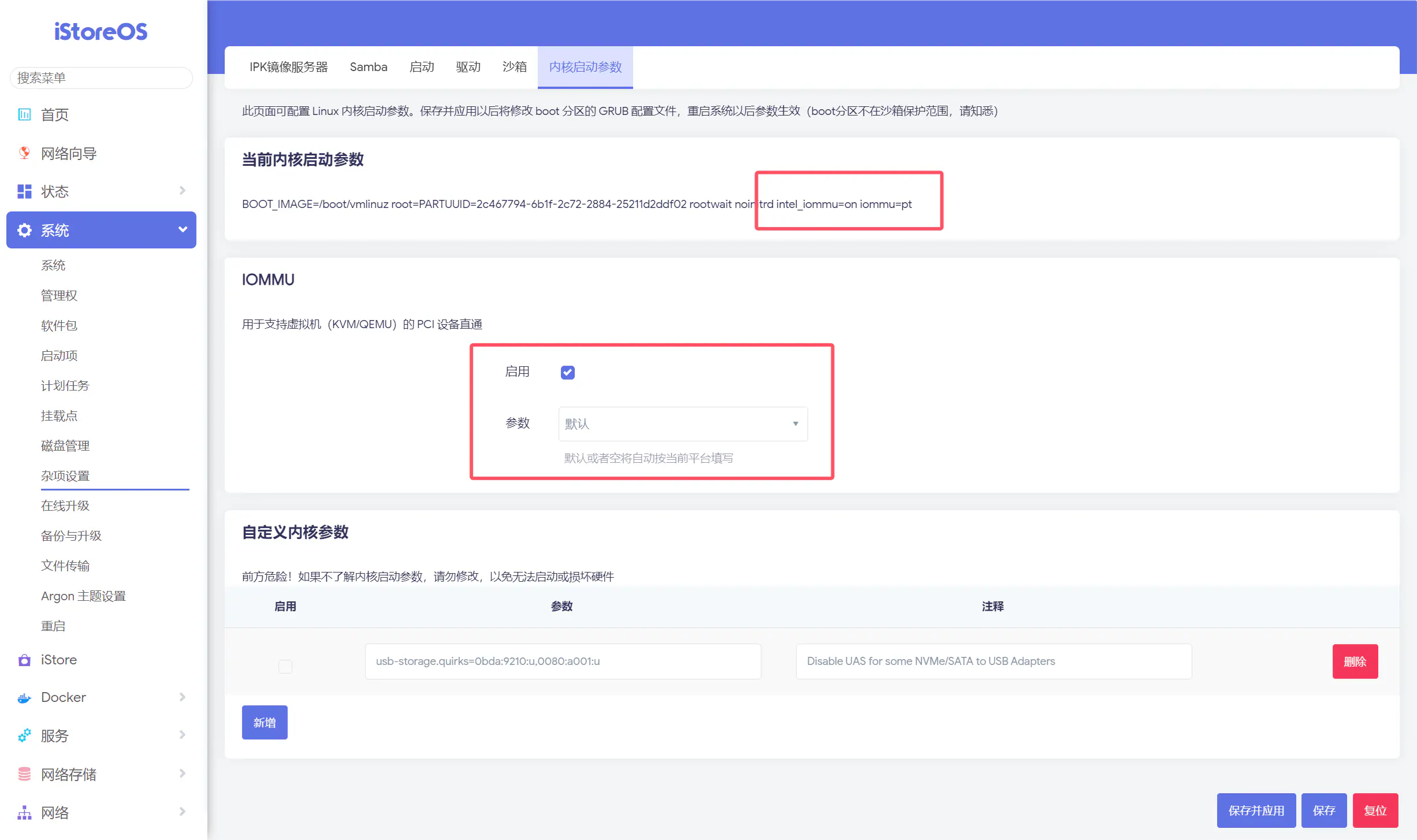 iStoreOS 照顾到了我们虚拟机用户,在 LuCI 界面即可完成直通的相关 GRUB 启动参数的配置,如果你是其它系统,可能要手动改一下 GRUB 的启动参数,加上对于 CPU 平台的 IOMMU 支持。