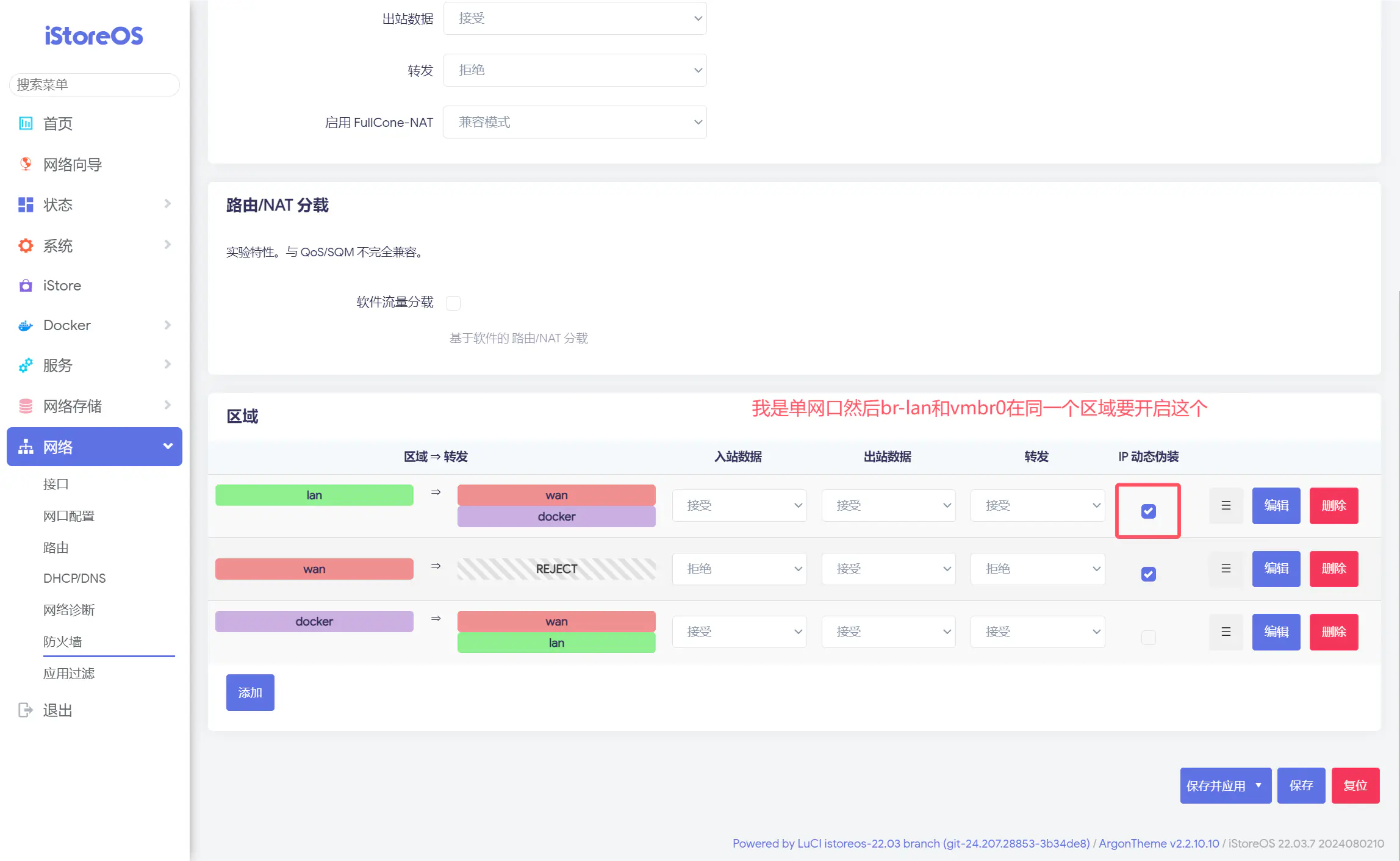 我这边是单网口机器,所以lan的作用相当于WAN(还要负责上网),有点神奇,而且pvevm也划分到防火墙的LAN区域了,所以要启用LAN区域间NAT转发。