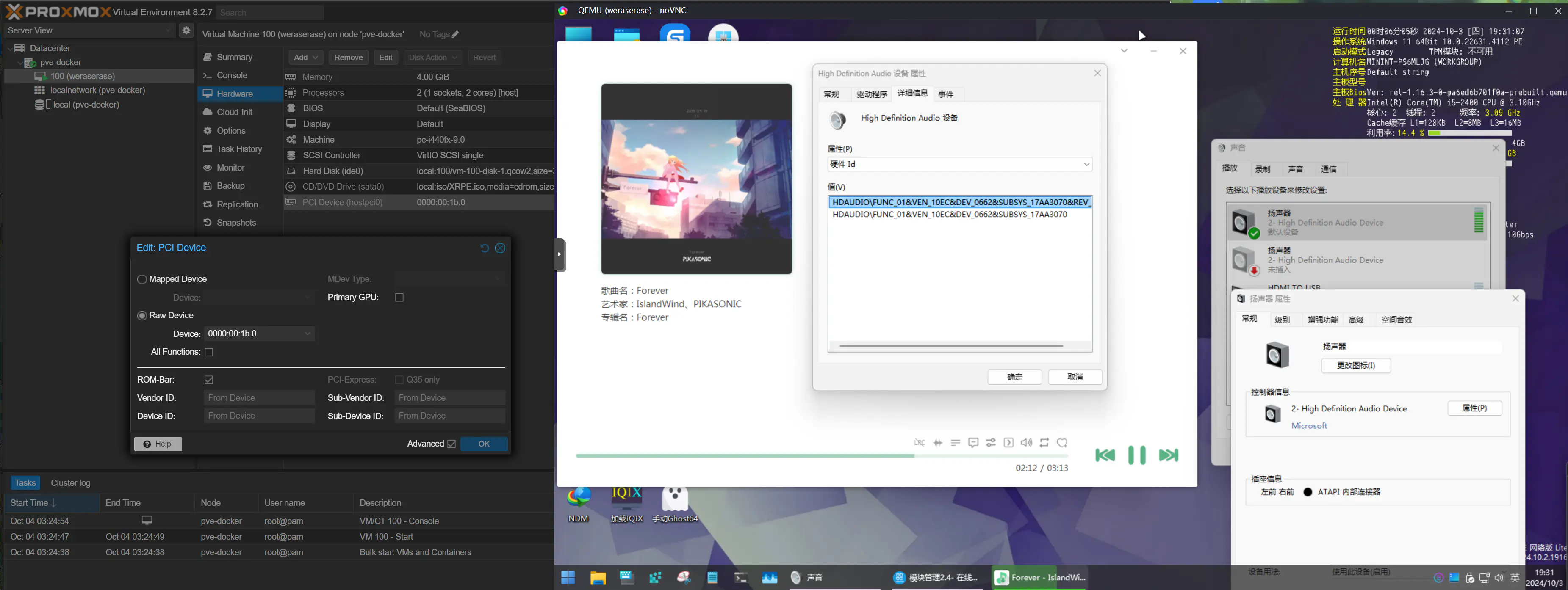 这里以直通集成声卡为例,在虚拟机里面直接添加 PCI 设备,一次就能成功。