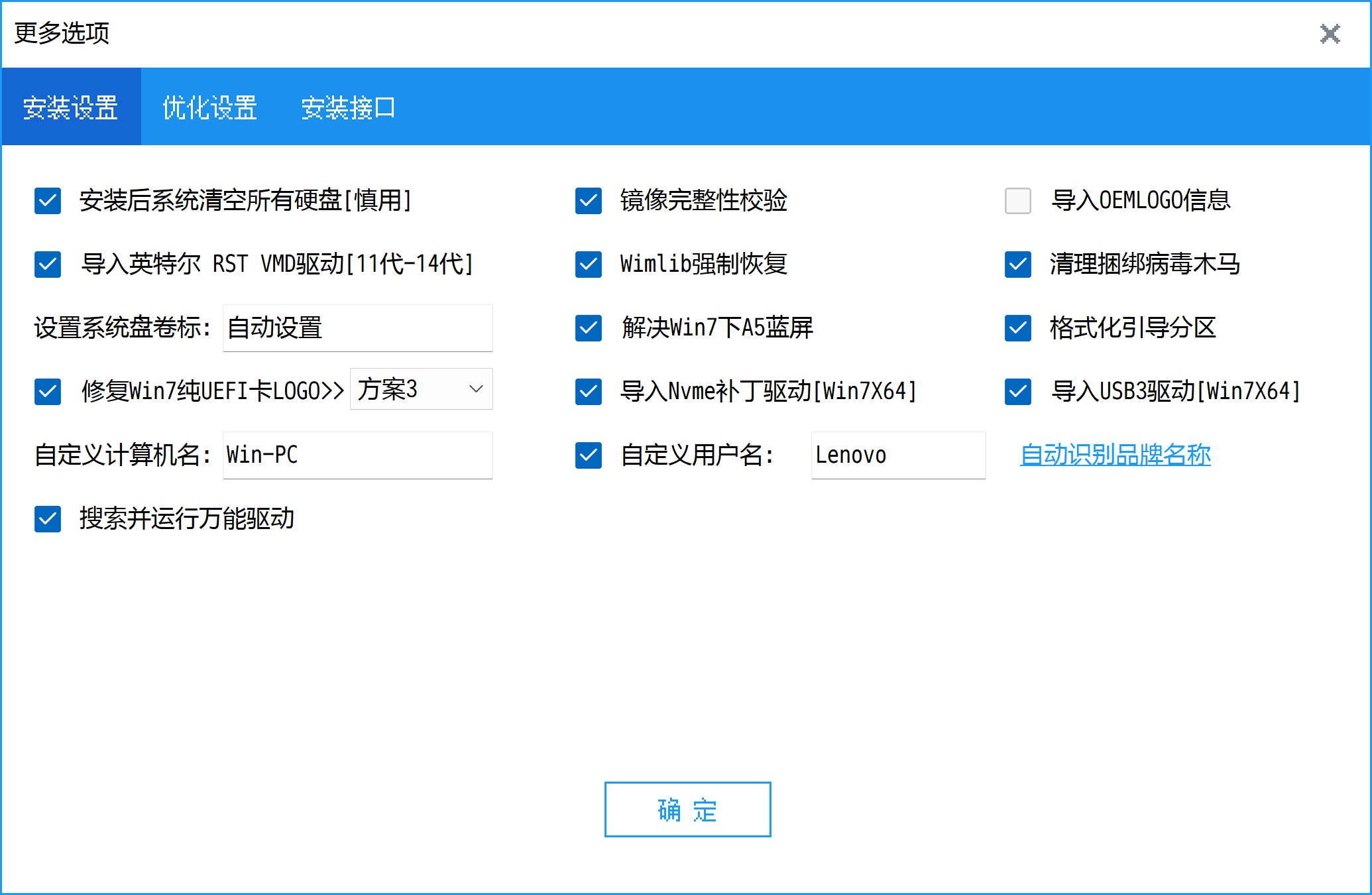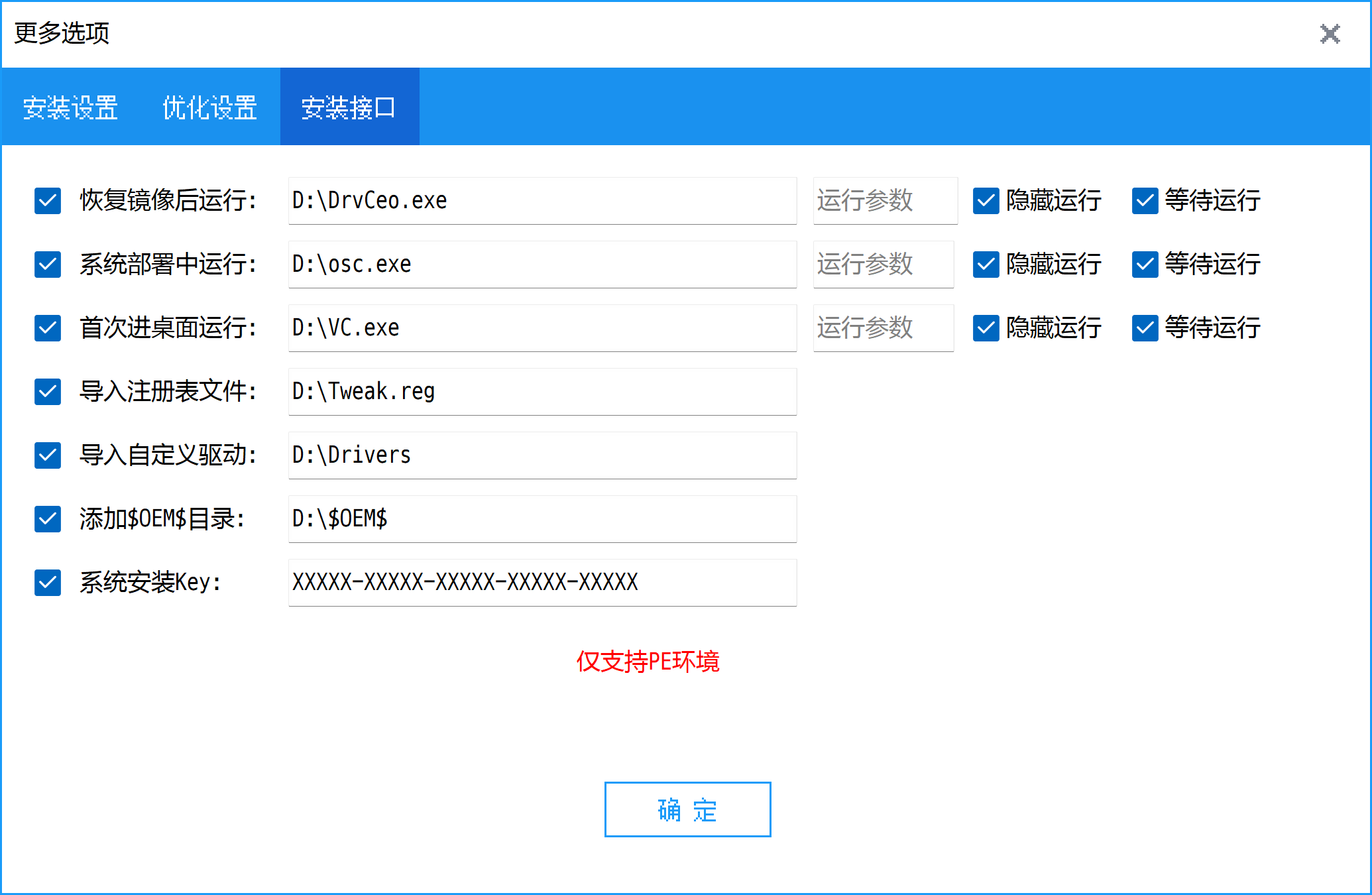 - 支持插件包,在还原系统阶段即安装完成,进入桌面即可使用;