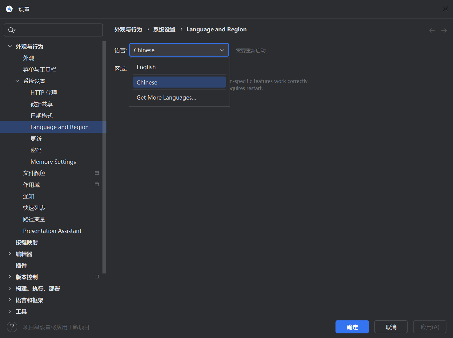 安装完成后点击 Apply,随后即可到 File | Settings | Appearance & Behavior | System Settings | Language and Region 设置为中文。