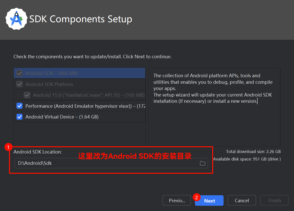 默认为 %LocalAppData%\Android\Sdk,由于 Android SDK 体积较大,我们可能需要将其存放到其它分区。